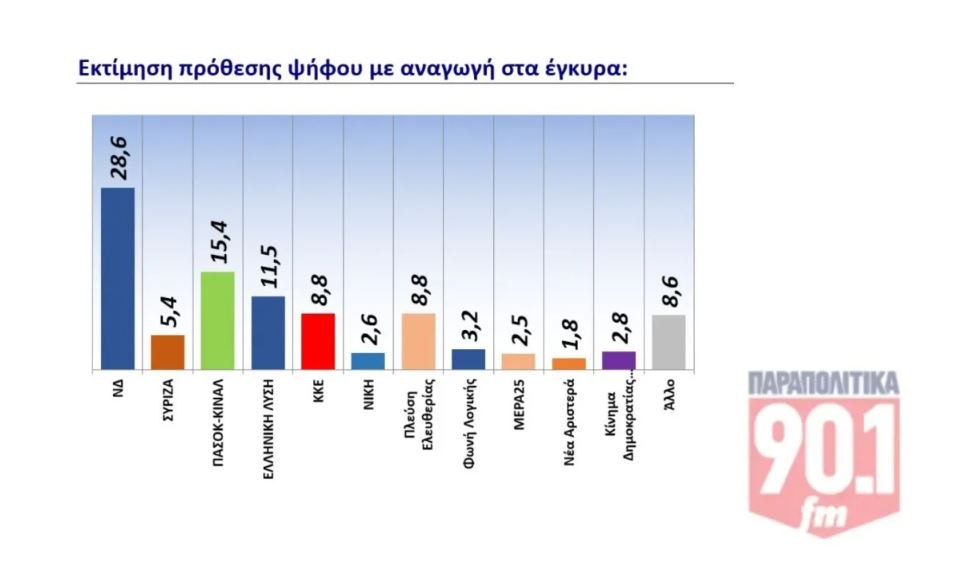Στην εκτίμηση ψήφου (με αναγωγή στα έγκυρα) τα ποσοστά διαμορφώνονται ως εξής: