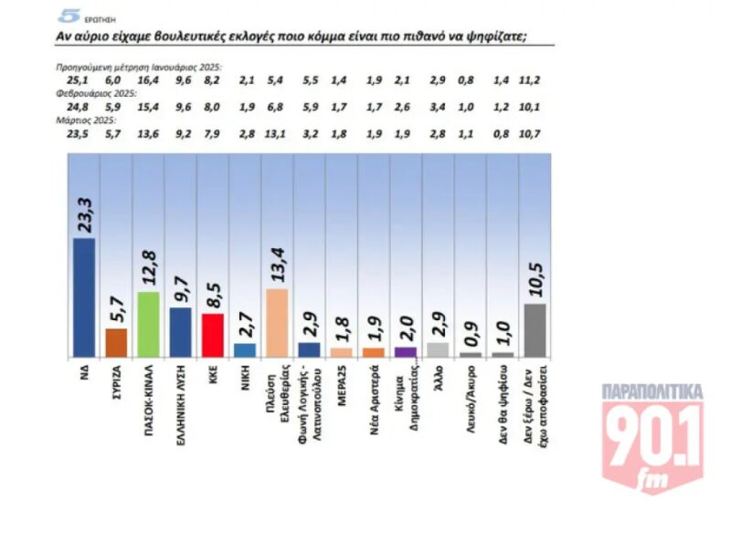 Σύμφωνα με τη δημοσκόπηση, η Νέα Δημοκρατία καταγράφει ποσοστό 23,3% στην πρόθεση ψήφου, ενώ η Πλεύση Ελευθερίας της Ζωής Κωνσταντοπούλου συνεχίζει την ανοδική πορεία και έρχεται δεύτερο κόμμα με 13,4%. Το ΠΑΣΟΚ-ΚΙΝΑΛ εξακολουθεί να έχει απώλειες, συγκεντρώνοντας 12,8%, ενώ ο ΣΥΡΙΖΑ καταγράφει μόλις 5,7%. Ενισχυμένη εμφανίζεται η Ελληνική Λύση με 9,7% και ακολουθούν το ΚΚΕ με 8,5%, η Νίκη με 2,7%, το Κίνημα Δημοκρατίας με 2,0, η Νέα Αριστερά με 1,9 και το Μέρα25 με 1,8. Αναποφάσιστοι δηλώνουν το 10,5%.