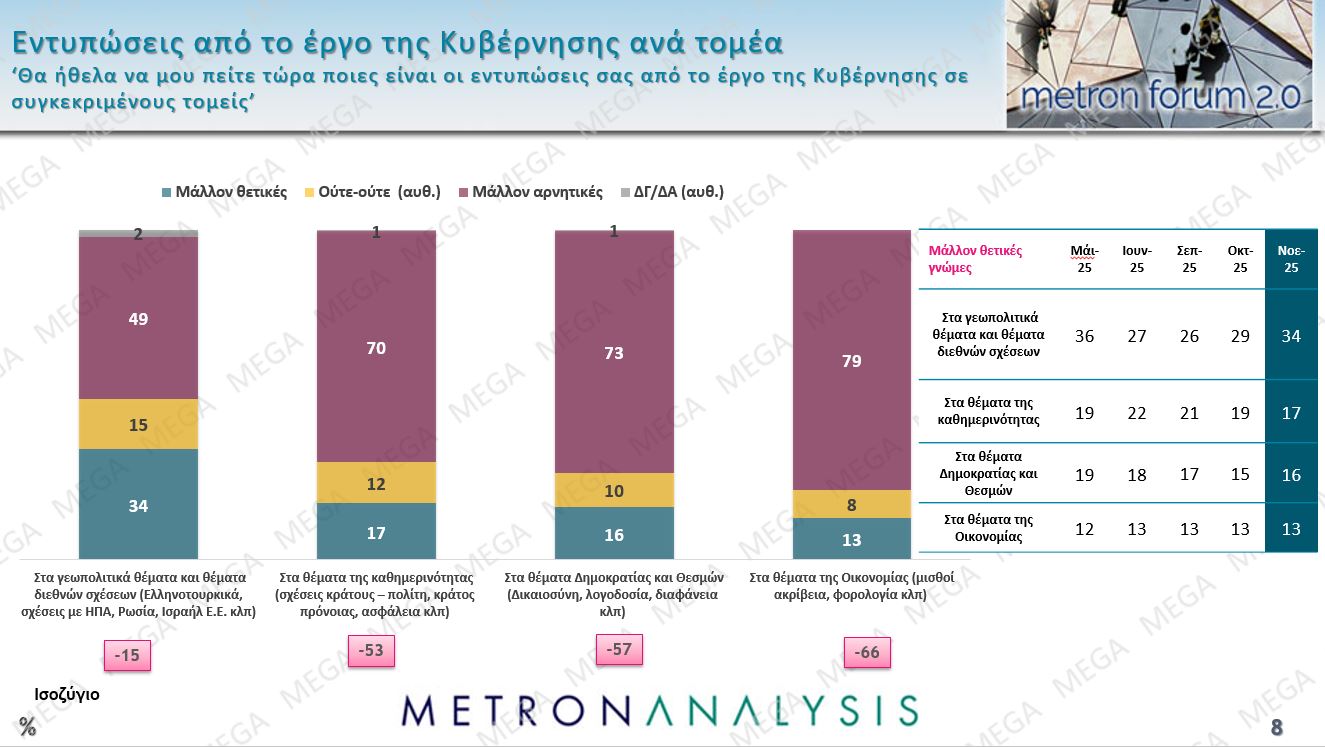 Ιδιαίτερα αρνητική είναι η «βαθμολογία» που παίρνει από τους πολίτες η κυβέρνηση σε όλους σχεδόν τους τομείς της δραστηριότητάς της. Σύμφωνα με τη δημοσκόπηση, 79% αρνητικές γνώμες στα θέματα της οικονομίας και ακρίβειας, σε πείσμα των εξαγγελιών στη ΔΕΘ, 73% αρνητική βαθμολογία σε σχέση με τα ζητήματα δημοκρατίας και θεσμών, 70% σε σχέση με τα θέματα καθημερινότητας και ασφάλειας. Μόνο σε σχέση με τα γεωπολιτικά ζητήματα η κυβέρνηση βλέπει να υποχωρούν οι αρνητικές γνώμες στο 49% και κυριως να ανεβαίνουν οι θετικές γνώμες στο 34%.