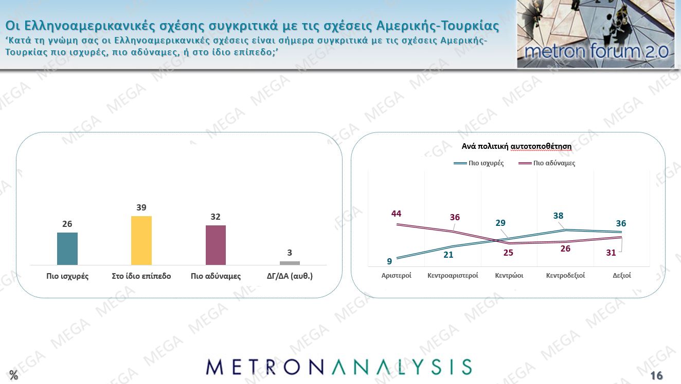Σε σχέση με τη συνολική κατάσταση των ελληνοαμερικανικών σχέσεων οι περισσότεροι (39%) υποστηρίζουν ότι είναι στο ίδιο επίπεδο, το 32% θεωρεί ότι είναι πιο αδύναμες και το μόνο το 26% θεωρεί ότι έχουν ισχυροποιηθεί. Κυρίως οι κεντροδεξιοί και δεξιοί ψηφοφόροι είναι αυτοί που θεωρούν ότι έχουν γίνει πιο ισχυρές.
