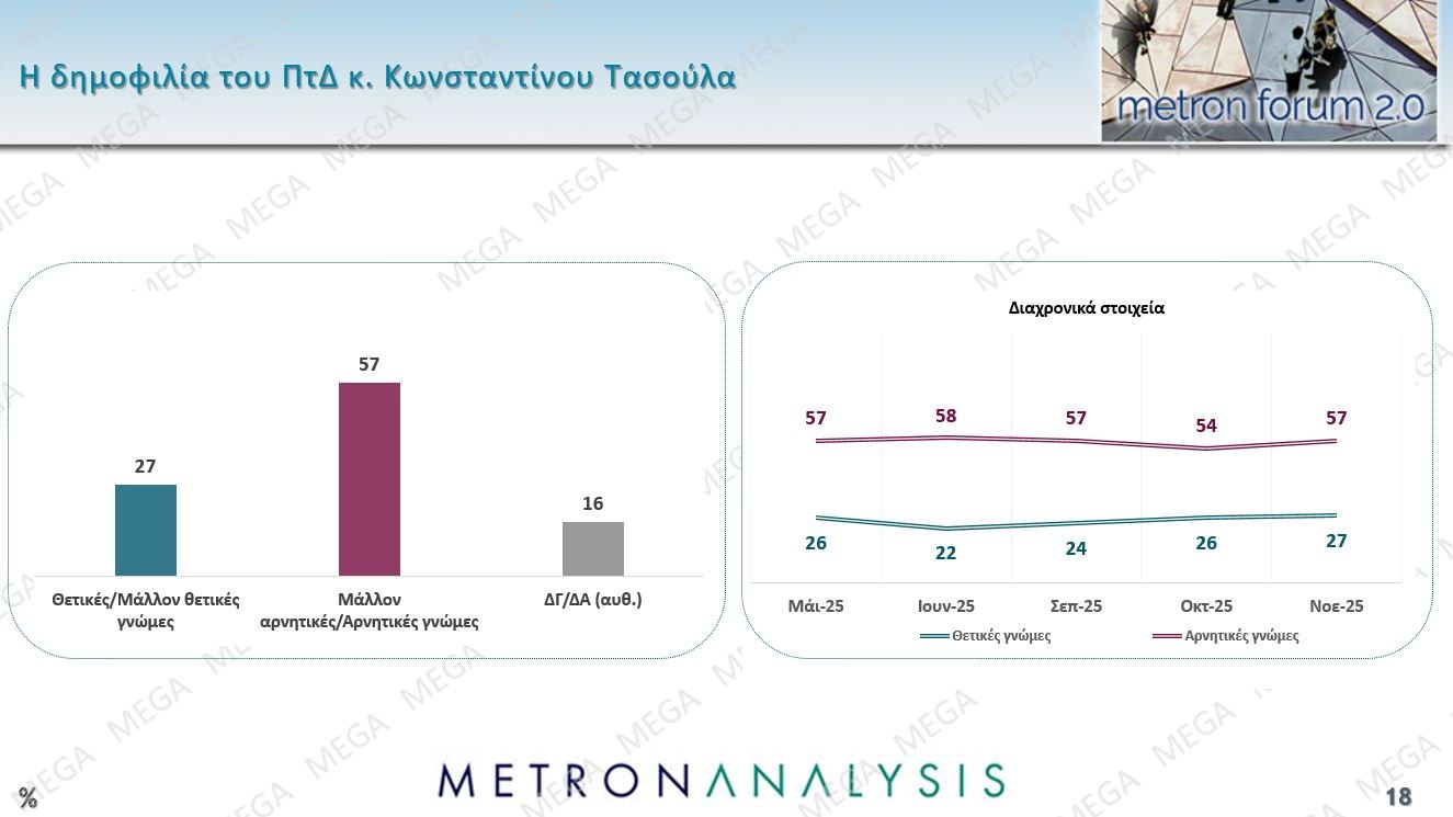 Ο ΠτΔ κ. Κωνσταντίνος Τάσουλας φαίνεται να μην έχει καταφέρει ακόμη να απαλλαγεί από το βάρος της προηγούμενης κομματικής του ταυτότητας. Ως αποτέλεσμα εξακολουθεί να έχει περισσότερες αρνητικές αξιολογήσεις (57%) παρά θετικές (27%), στοιχείο σταθερό σε όλες τις έρευνες μετά την εκλογή του.