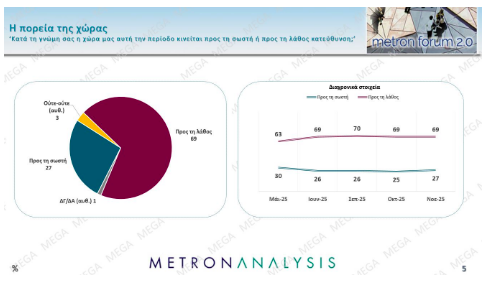 Οι πολίτες εξακολουθούν στη μεγάλη τους πλειοψηφία (69%) να πιστεύουν ότι τα πράγματα πηγαίνουν προς τη λάθος κατεύθυνση, κάτι που δείχνει ότι έχουν αποτύχει οι κυβερνητικές προσπάθειες να αντιστραφεί αυτό το κλίμα.