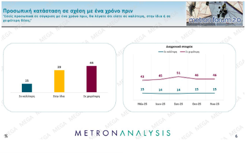Αντίστοιχα, οι περισσότεροι συγκριτικά πολίτες δηλώνουν στη δημοσκόπηση ότι η δική τους κατάσταση έχει επιδεινωθεί σε σχέση με έναν χρόνο πριν, αρκετοί υποστηρίζουν ότι είναι ίδια, και βελτίωση δηλώνει μόνο το 15%, κάτι που αντιστοιχεί και στα αποτελέσματα των προηγούμενων ερευνών της Metron Analysis.