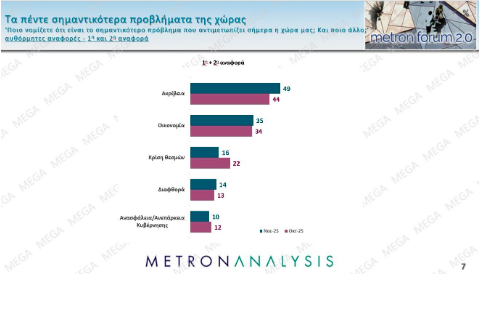 Ως προς τα προβλήματα που αντιμετωπίζουν οι πολίτες, η δημοσκόπηση της Metron Analysis δείχνει ότι κορυφαίο πρόβλημα παραμένει η ακρίβεια, την οποία αναφέρει το 49% των ερωτηθέντων και ακολουθείται από την οικονομία, που παραπέμπει στο ίδιο εύρος προβλημάτων, ενώ ψηλά παραμένει η κρίση θεσμών. Ενδιαφέρον έχει ότι αυξάνει και το ποσοστό των πολιτών που επικαλούνται και τη διαφθορά ως πρόβλήμα.