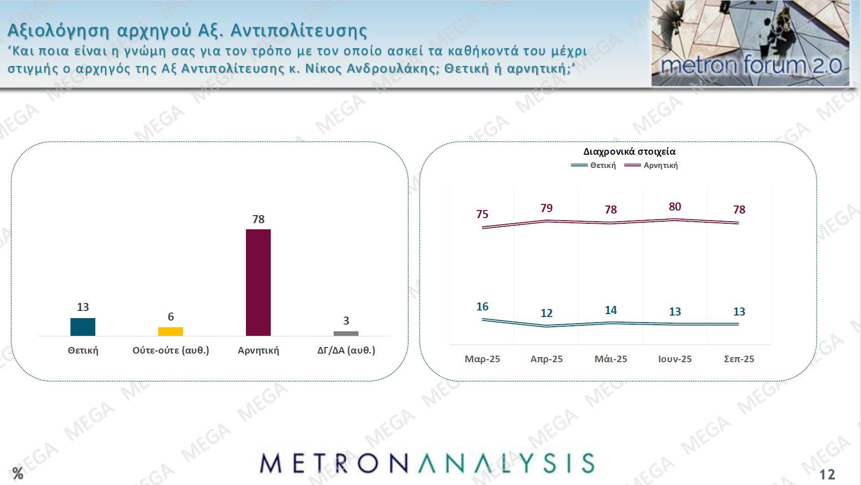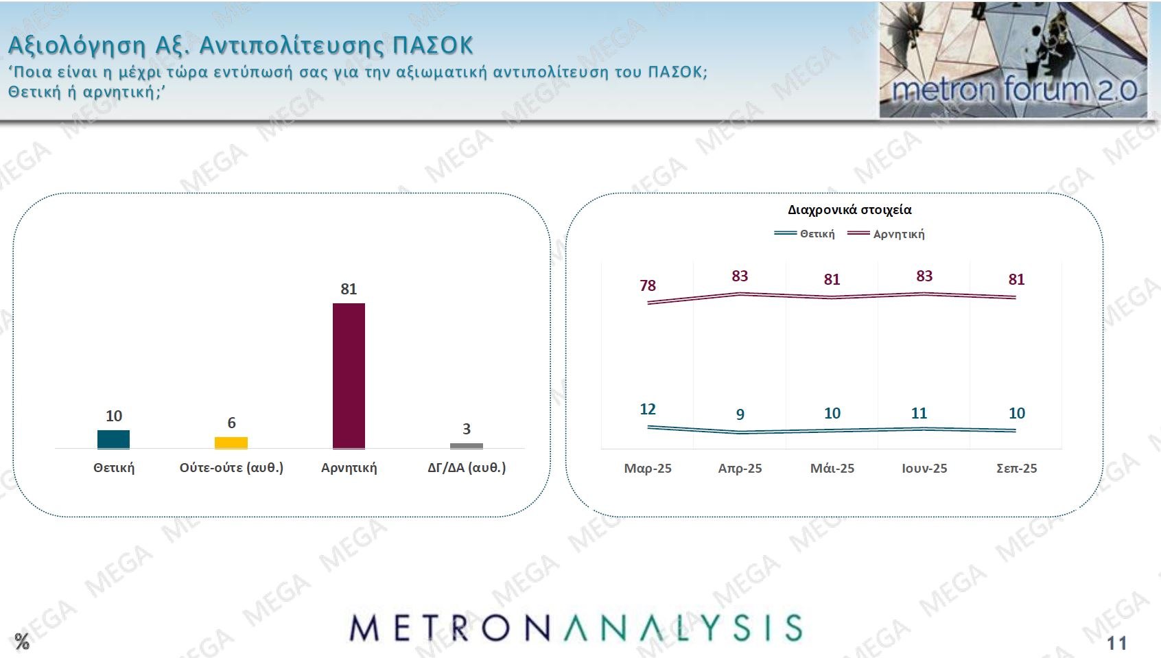Παρότι η κυβέρνηση και ο ίδιος ο πρωθυπουργός προσωπικά επένδυσαν ιδιαίτερα στον αντίκτυπο που θα είχαν τα μέτρα που ανακοινώθηκαν στη ΔΕΘ, θεωρώντας τα ουσιαστικά ως το σημείο καμπής για την έναρξη μιας διαδικασίας επανασυσπείρωσης ψηφοφόρων στον ορίζοντα των εκλογών του 2027, τα στοιχεία από τη δημοσκόπηση της Metron Analysis για το MEGA δείχνουν ότι η κοινωνία μάλλον επέστρεψε το μήνυμα, αφού καταγράφεται ιδιαίτερα έντονη αποδοκιμασία της κυβερνητικής πολιτικής και δημοσκοπική «χαμηλή πτήση» για τη Νέα Δημοκρατία.