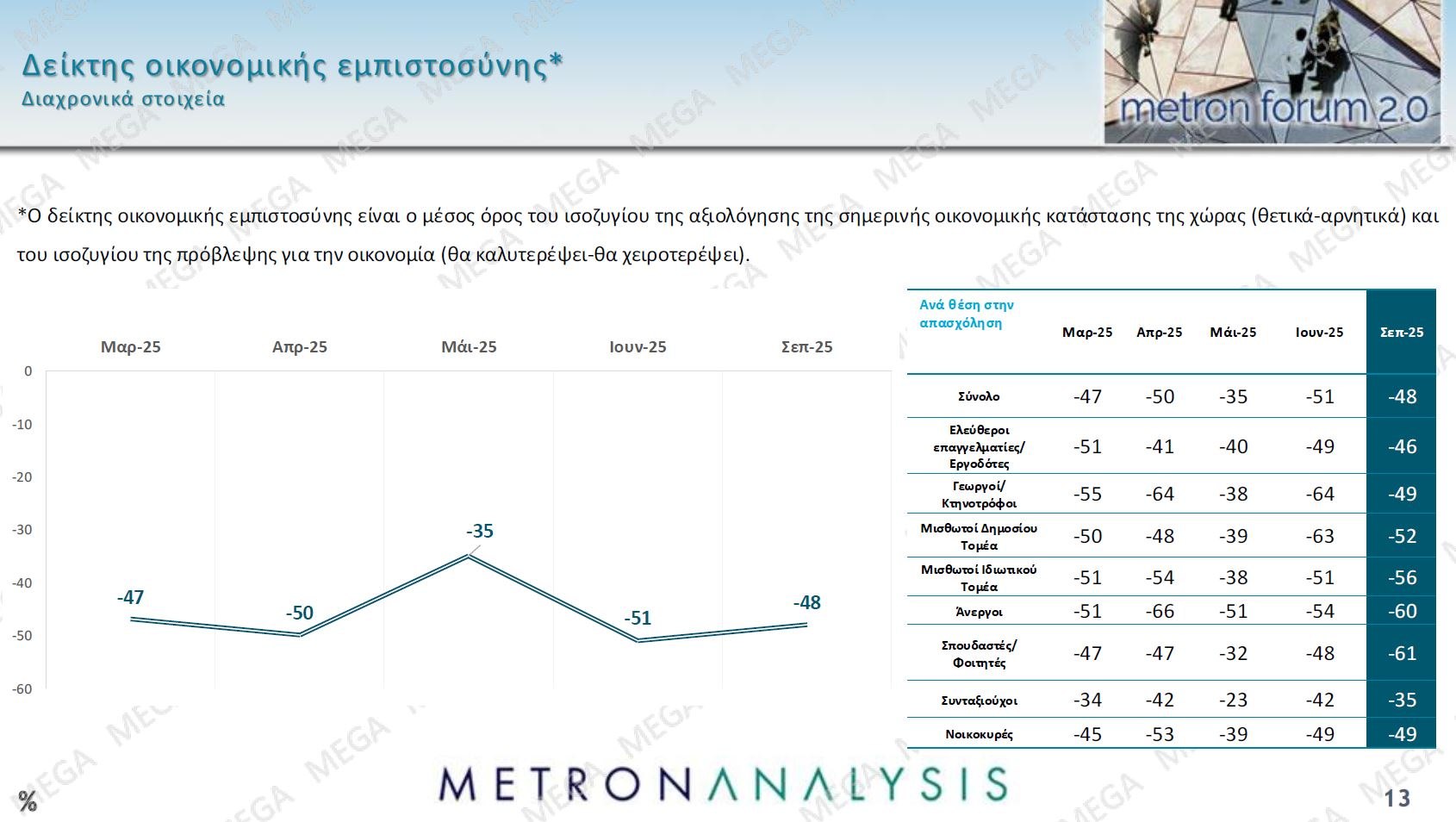 Ως αποτέλεσμα της αρνητικής αποτίμησης και της έλλειψη αισιοδοξίας ο δείκτης οικονομικής εμπιστοσύνης, δηλαδή ο μέσος όρος του ισοζυγίου της αξιολόγησης της οικονομικής κατάστασης της χώρας και του ισοζυγίου της πρόβλεψης για την οικονομία παραμένει σε χαμηλά επίπεδα, με πρωταθλητές της οικονομικής απαισιοδοξίας τους γεωργούς και κτηνοτρόφους και τους μισθωτούς του δημοσίου τομέα.