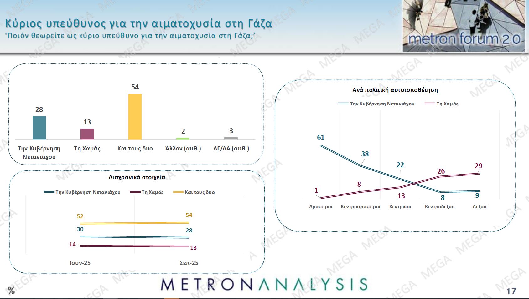 Ως προς την αιματοχυσία στη Γάζα το 28% θεωρεί υπεύθυνη την κυβέρνηση Νετανιάχου, το 13% τη Χαμάς και το 54% και τους δύο, με όσους αποδίδουν την ευθύνη στην κυβέρνηση Νετανιάχου να προέρχονται κυρίως από την αριστερά, την κεντροαριστερά και το κέντρο, ενώ κεντροδεξιοί και δεξιοί αποδίδουν πρωτίστως ευθύνη στην Χαμάς. Ωστόσο το 76% τίθεται υπέρ της ίδρυσης ανεξάρτητου παλαιστινιακού κράτους, τοποθέτηση που είναι πλειοψηφική σε όλο το ιδεολογικό φάσμα.