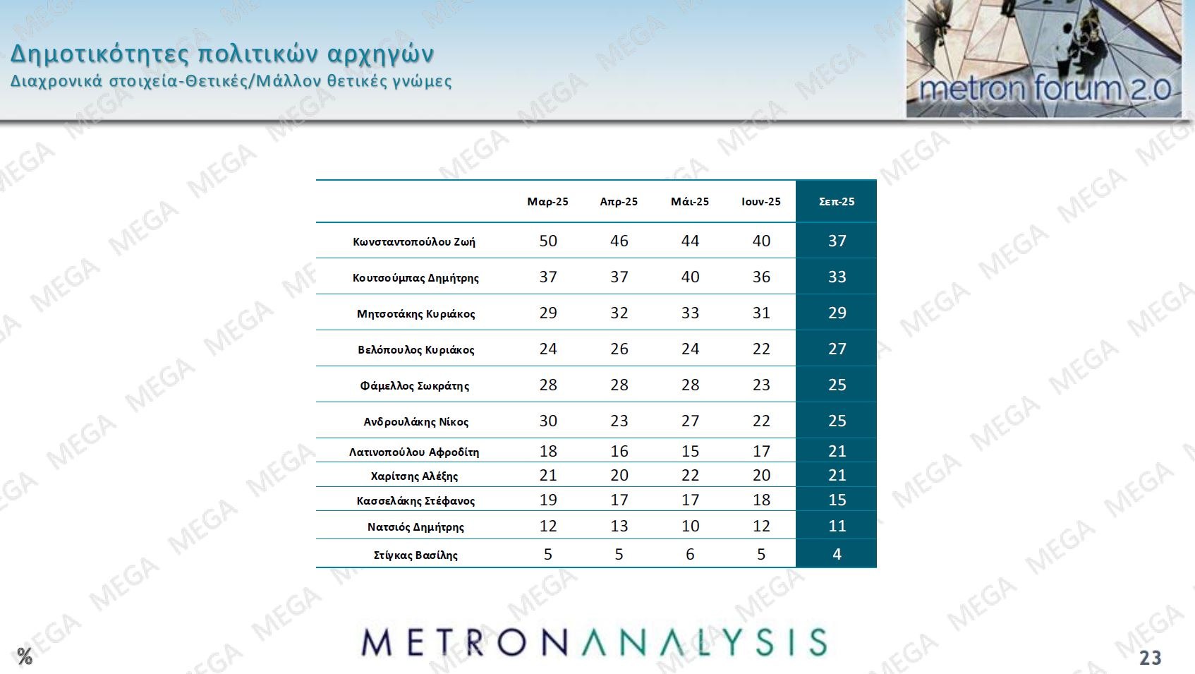 Ως προς τη δημοτικότητα των πολιτικών αρχηγών δεν υπάρχουν αλλαγές στην κατάταξη. Όπως και σε προηγούμενες έρευνες η Ζωή Κωνσταντοπούλου έχει τις περισσότερες θετικές γνώμες και ακολουθείται από τον Δημήτρη Κουτσούμπα και τρίτο τον πρωθυπουργό Κυριάκο Μητσοτάκη. Βελτιωμένες επιδόσεις έχουν Κυριάκος Βελόπουλος, Σωκράτης Φάμμελος και Νίκος Ανδρουλάκης.