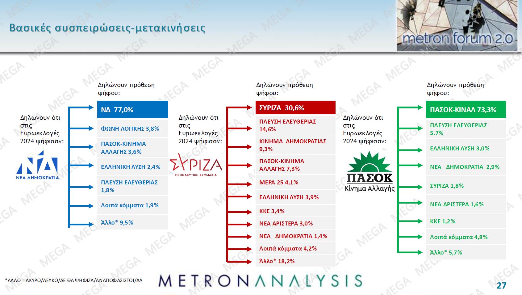 Η Νέα Δημοκρατία εμφανίζει διαρροές προς τη Φωνή Λογικής, το ΠΑΣΟΚ και την Ελληνική Λύση, ο ΣΥΡΙΖΑ προς την Πλεύση Ελευθερίας, το Κίνημη Δημοκρατίας και το ΠΑΣΟΚ, και το ΠΑΣΟΚ προς την Πλεύση Ελευθερίας, την Ελληνική Λύση και τη Νέα Δημοκρατίας.