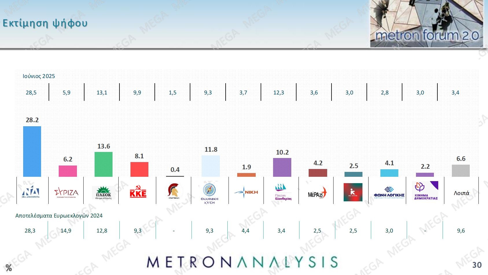 Στη βάση των παραπάνω η εκτίμηση της δημοσκόπησης της Metron Analysis για το πώς διαμορφώνονται οι κομμματικοί σχηματισμοί, αυτό που συνήθως ονομάζουμε εκτίμηση ψήφου, είναι ότι η Νέα Δημοκρατία βρίσκεται στο 28,2%, δηλαδή ελαφρά πιο κάτω σε σχέση με τον Ιούνιο. Αυτό σημαίνει ότι όχι μόνο απέχει πολύ από την αυτοδυναμία αλλά και παραμένει κάτω από το συμβολικό-«ψυχολογικό» όριο του 30%. Πράγμα που επιβεβαιώνει ότι οι εξαγγελίες στη ΔΕΘ δεν τροποποίησαν έναν πολιτικό σύσχετισμό που κατά βάση διαμορφώνεται από το πώς οι πολίτες παραμένουν βαθιά δυσαρεστημένοι και απαισιόδοξοι.