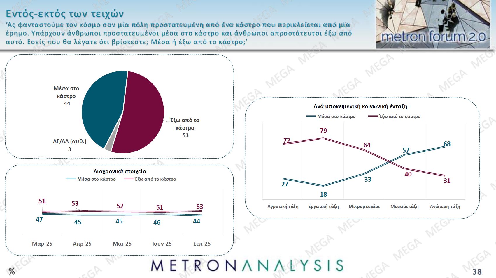 Στην ερώτηση για το πώς αισθάνονται, εντός ή εκτός των τειχών, το 53% θεωρεί ότι είναι εκτός, αποτυπώνοντας ένα βαθύτερο αίσθημα επισφάλειας, κάτι που αποτυπώνεται και στο ότι πιο έντονο είναι αυτό το αίσθημα μεταξύ όσων δηλώνουν αγρότες, εργάτες και μικρομεσαίοι, σε αντιδιαστολή με όσους δηλώνουν μεσαία και ανώτερη τάξη. Κατεξοχήν κόμμα των «εντός των τειχών» η Νέα Δημοκρατία.