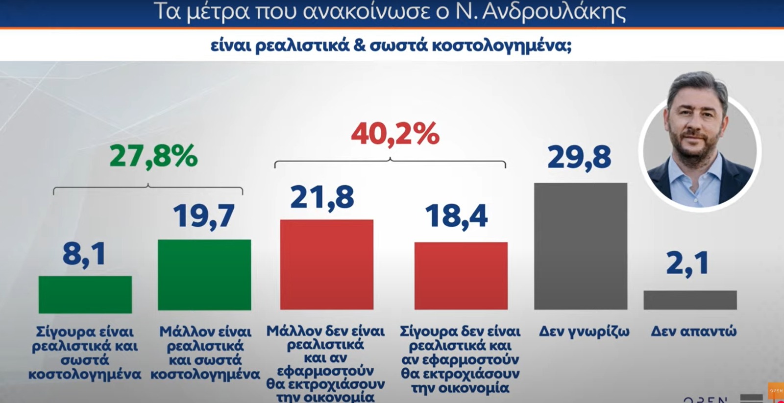 Όσον αφορά τα μέτρα που ανακοίνωσε ο Νίκος Ανδρουλάκης στη ΔΕΘ φαίνεται πως οι ερωτηθέντες δεν τα θεωρούν ρεαλιστικά και σωστά κοστολογημένα.