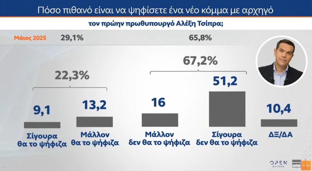 Όσον αφορά το «κόμμα Τσίπρα» και το ερώτημα «πόσο πιθανό είναι να ψηφίσετε ένα νέο κόμμα με αρχηγό τον πρώην πρωθυπουργό Αλέξη Τσίπρα» οι ερωτηθέντες απαντούν: