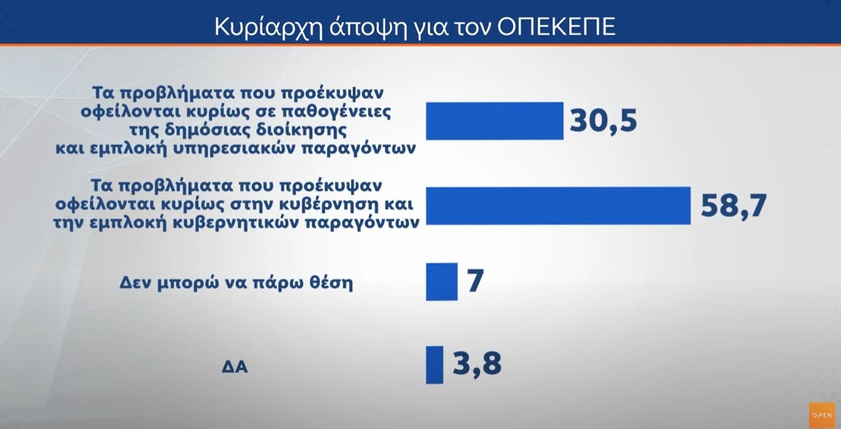 Όσον αφορά την κυρίαρχη άποψη για τον ΟΠΕΚΕΠΕ το 30,5% αναφέρει πως «τα προβλήματα που προέκυψαν οφείλονται κυρίως σε παθογένειες της δημόσιας διοίκησης και εμπλοκή υπηρεσιακών παραγόντων», το 58,7% «τα προβλήματα που προέκυψαν οφείλονται κυρίως στην κυβέρνηση και την εμπλοκή κυβερνητικών παραγόντων», το 7% «δεν μπορώ να πάρω θέση» και το 3,8% δεν απαντά.