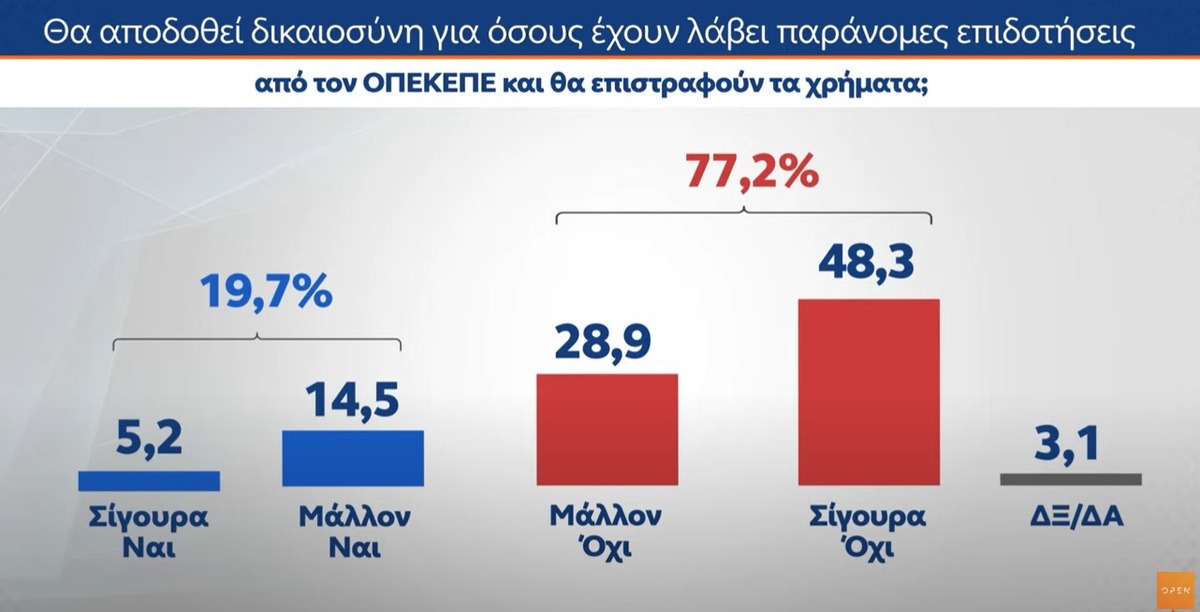 Στο ερώτημα «θα αποδοθεί δικαιοσύνη για όσους έχουν λάβει παράνομες επιδοτήσεις από τον ΟΠΕΚΕΠΕ και θα επιστραφούν τα χρήματα» οι πολίτες απαντούν