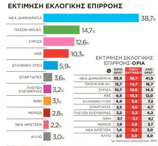 Στην εκτίμηση εκλογικής επιρροής, η Νέα Δημοκρατία συγκεντρώνει 38,7%, το ΠΑΣΟΚ-ΚΙΝΑΛ είναι ξανά δεύτερο κόμμα με 14,7% και ακολουθούν ο ΣΥΡΙΖΑ με 12,6% και το ενισχυμένο ΚΚΕ με 10,3%.