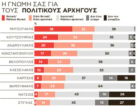 Χαρακτηριστικό είναι ότι στην πέμπτη θέση βρίσκεται ο Κυριάκος Βελόπουλος με 14% (58% αρνητικές γνώμες), περνώντας τον Στέφανο Κασσελάκη, ο οποίος έρχεται έκτος με 10% (53% αρνητικές γνώμες).