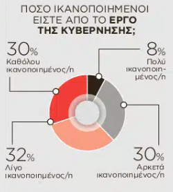Όσο για την αξιολόγηση του έργου της κυβέρνησης, το 62% δηλώνει καθόλου ή λίγο ικανοποιημένο και το 38% πολύ και αρκετά.
