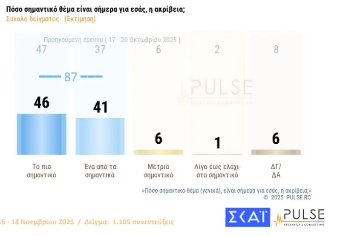 Σε ερωτήματα όπως πόσο σημαντικό θεωρούν το ζήτημα της ακρίβειας, κλήθηκαν να απαντήσουν οι πολίτες που συμμετείχαν στη δημοσκόπηση της PULSE, τα αποτελέσματα της οποίας παρουσιάστηκαν το βράδυ της Πέμπτης (20/11/25).