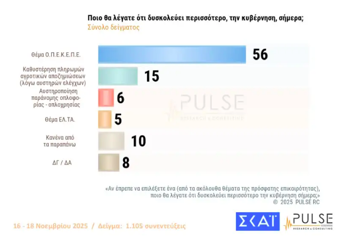 Στο ποιο ζήτημα δυσκολεύει περισσότερο την κυβέρνηση, το 56% των πολιτών που ρωτήθηκαν, απαντά το θέμα του ΟΠΕΚΕΠΕ.