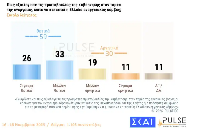 Στο πώς αξιολογούν τις πρωτοβουλίες της κυβέρνησης στον τομέα της ενέργειας ώστε να καταστεί η Ελλάδα ενεργειακό κόμβος, οι πολίτες απάντησαν θετικά σε ποσοστό 59% (26% σίγουρα θετικά και 33% μάλλον θετικά). Αντίθετα, περίπου ένας στους τρεις (30%) δεν εμφανίζεται ικανοποιημένο.