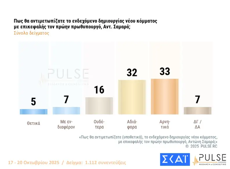 Στην ερώτηση για τη δημιουργία νέου κόμματος από τον Αντώνη Σαμαρά, οι περισσότεροι πολίτες θα το αντιμετώπιζαν αρνητικά (33%), αδιάφορα (32%) ουδέτερα (16%) και με ενδιαφέρον (7%).