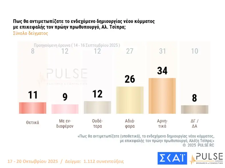 Στο πώς θα αντιμετώπιζαν ένα νέο κόμμα από τον Αλέξη Τσίπρα, το 34% δήλωσε ότι θα το αντιμετωπίζει αρνητικά ενώ το 26% αδιάφορα. Θετικά, απάντησε το 11%…
