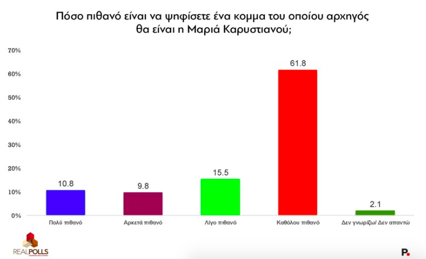 Στο ερώτημα «Πόσο πιθανό είναι να ψηφίσετε ένα κόμμα της Καρυστιανού;», το 10,8% απαντά «πολύ πιθανό» και 9,8% «αρκετά πιθανό», ποσοστά χαμηλότερα σε σχέση με τον Ιανουάριο.