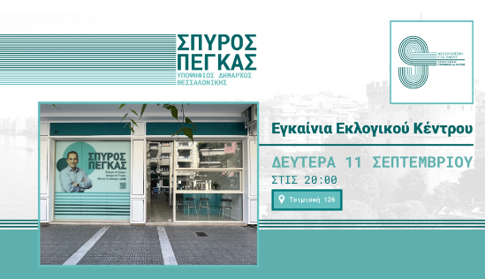 Ο υποψήφιος δήμαρχος Θεσσαλονίκης Σπύρος Πέγκας και επικεφαλής της δημοτικής κίνησης «Θεσσαλονίκη Για Όλους» σας προσκαλεί στα εγκαίνια του εκλογικού του κέντρου, στην οδό Τσιμισκή 126, στο κέντρο της Θεσσαλονίκης.