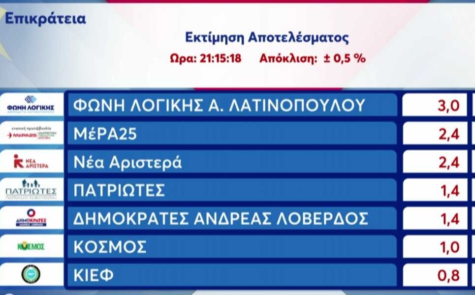 Λίγο πριν τις 21:30 η Singular Logic έδωσε την εκτίμηση για το αποτέλεσμα των Ευρωεκλογών 2024 στην ελληνική επικράτεια.