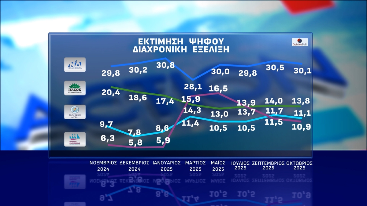 Σταθερό προβάδισμα καταγράφει η Νέα Δημοκρατία σε νέο γκάλοπ της Opinion Poll για λογαριασμό του Action 24. Ειδικότερα, στη νέα δημοσκόπηση η Νέα Δημοκρατία συγκεντρώνει ποσοστό 30,1% με το ΠΑΣΟΚ να ακολουθεί με 13,8%. Στην τρίτη θέση το κόμμα του Κυριάκου Βελόπουλου με 11,1% πάνω από την Πλεύση Ελευθερίας που περιορίζεται στην τέταρτη θέση με 10,9%.