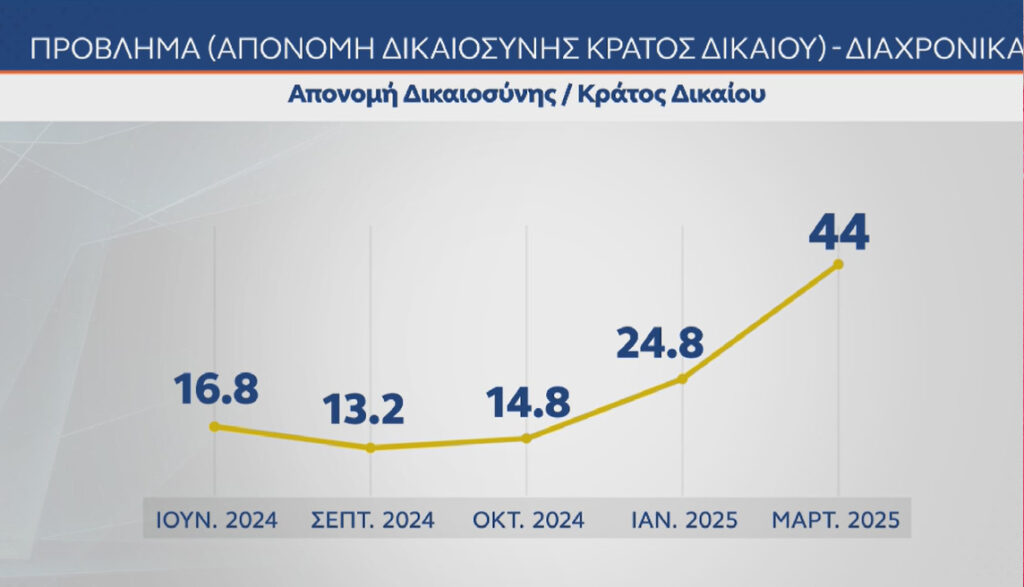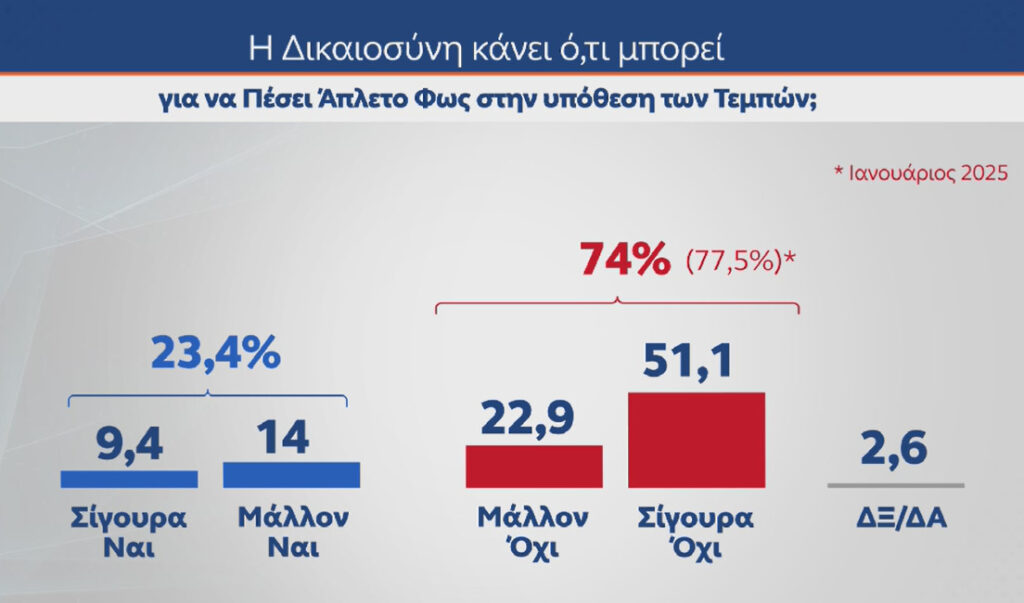 Είναι ενδεικτικό ότι το πρόβλημα της απονομής της δικαιοσύνης ανεβαίνει πάρα πολύ σε ποσοστό, ενώ αυτό που συνέβη στα Τέμπη χαρακτηρίζεται από τους πολίτες «έγκλημα».