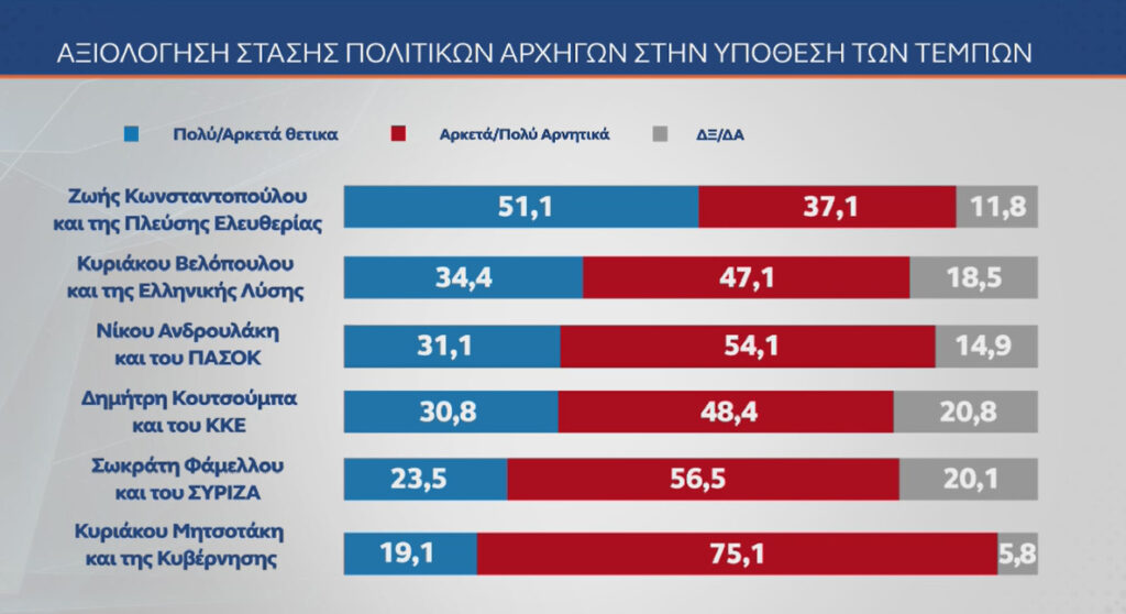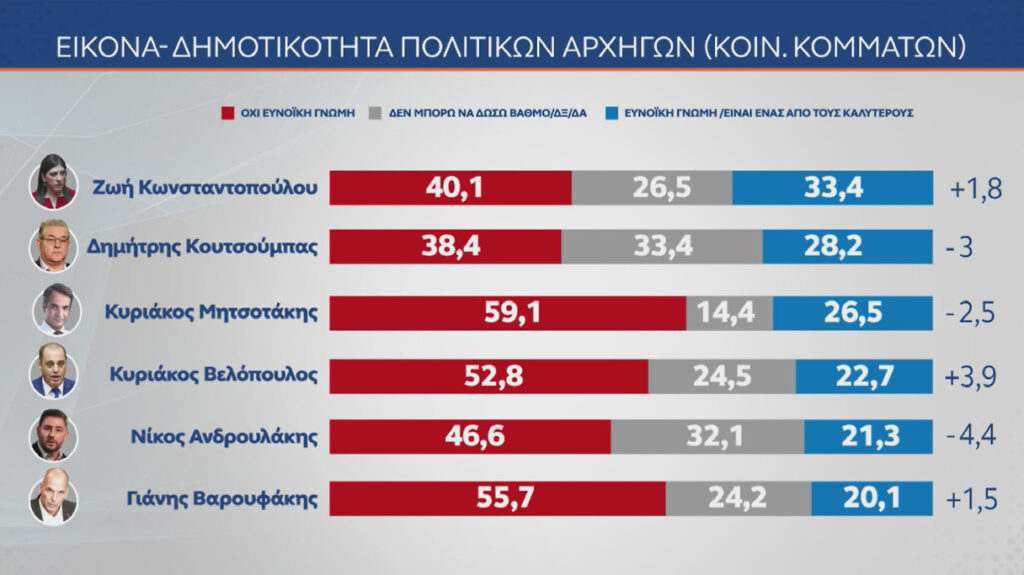 Αναφορικά με τη δημοτικότητα των πολιτικών αρχηγών, η δημοσκόπηση δίνει την πρώτη θέση στη Ζωή Κωνσταντοπούλου με 33,4% θετικές γνώμες (40,1% αρνητικές) και ακολουθούν ο Δημήτρης Κουτσούμπας με 28,2% (38,4% αρνητικές, όντας πρώτος στη σχετική λίστα) και ο Κυριάκος Μητσοτάκης με 26,5% θετικές και 59,1% αρνητικές γνώμες, που τον κατατάσσει πρώτο στην «κόκκινη μπάρα».