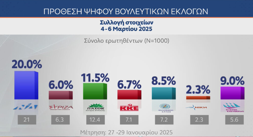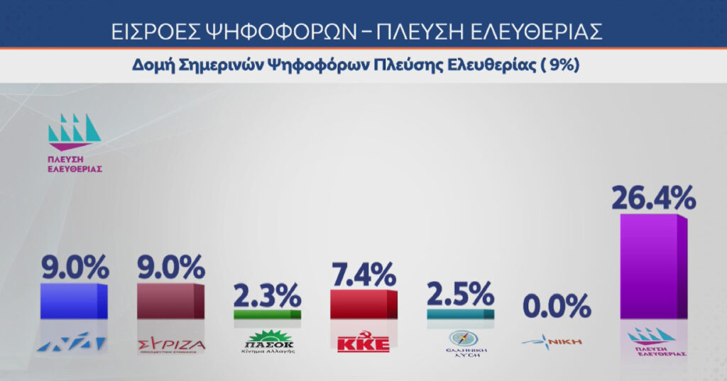 Νέα Δημοκρατία 20% ΠΑΣΟΚ 11,5% Πλεύση Ελευθερίας 9% Ελληνική Λύση 8,5% ΚΚΕ 6,7% ΣΥΡΙΖΑ 6% Νίκη 2,3%