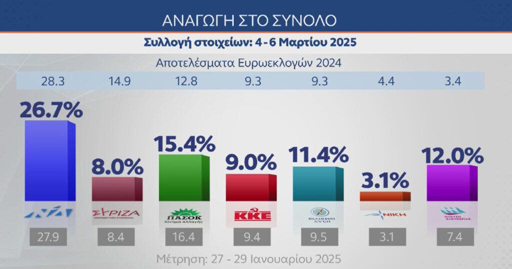 Νέα Δημοκρατία 26,7% ΠΑΣΟΚ 15,4% Πλεύση Ελευθερίας 12% Ελληνική Λύση 11,4% ΚΚΕ 9% ΣΥΡΙΖΑ 8% Νίκη 3,1%