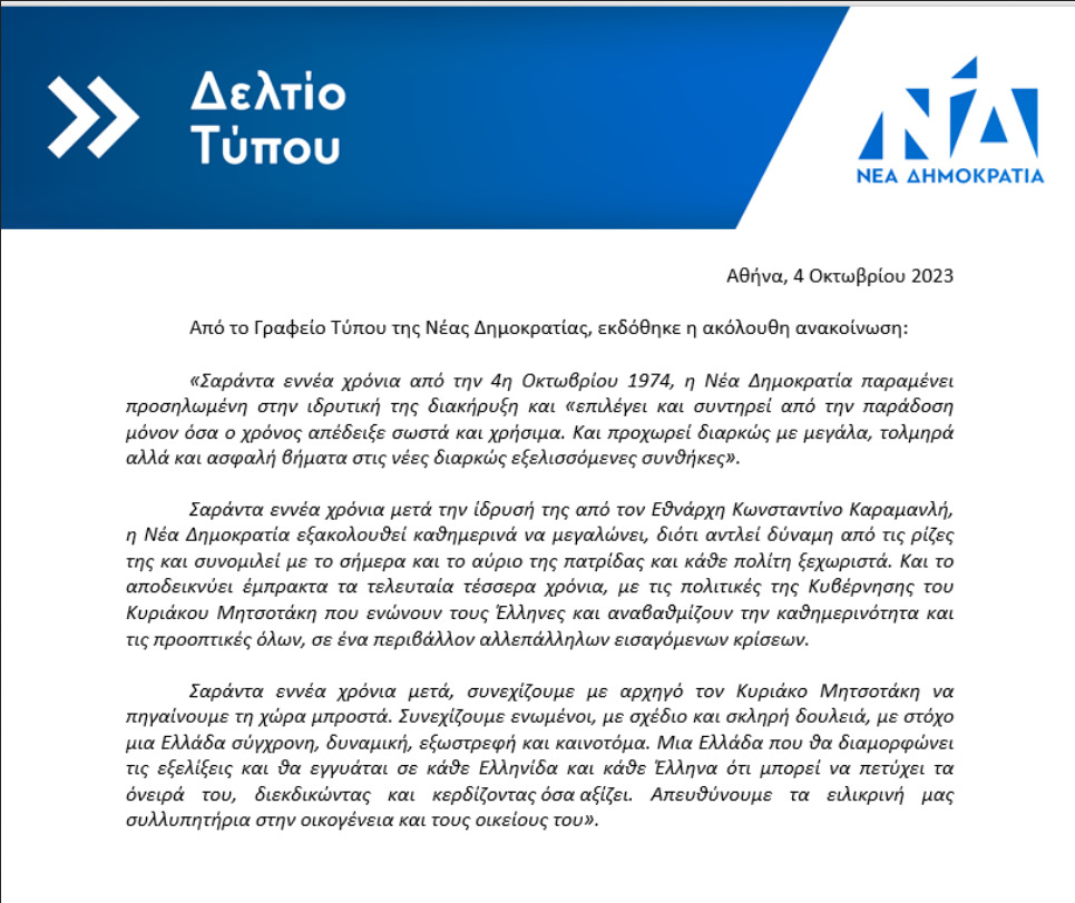 Τι είχε συμβεί; Το Γραφείο Τύπου της Νέας Δημοκρατίας, με αφορμή την επέτειο για τη συμπλήρωση 49 ετών από την ίδρυσή της, έδωσε μία ανακοίνωση, μέσω της οποίας, όμως, εξέφραζε και τα συλλυπητήριά της ΝΔ.