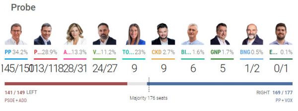 Πάντως σύμφωνα με το Reuters το PP, φαίνεται να υπολείπεται της απόλυτης κοινοβουλευτικής πλειοψηφίας, την οποία ωστόσο θα μπορούσε να επιτύχει σε μια πιθανή σύμπραξη με το ακροδεξιό Vox, όπως έδειξαν δύο έρευνες.