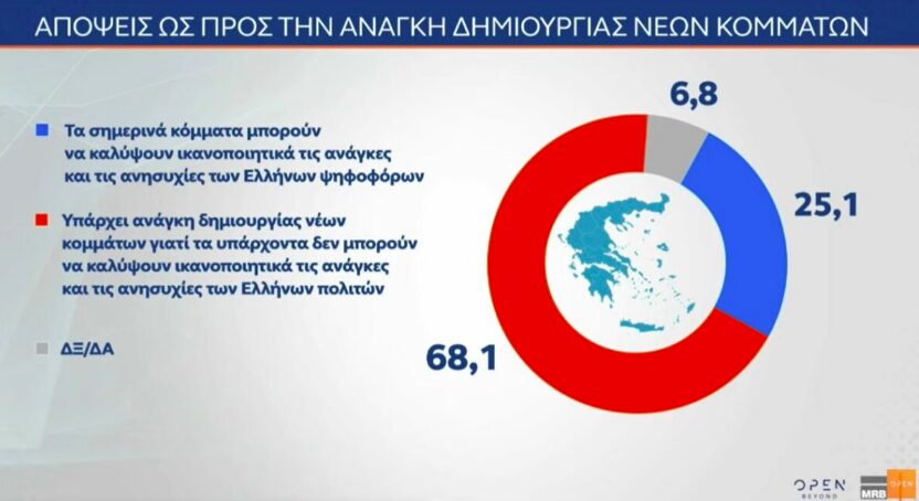 Ειδικότερα, ως προς την ανάγκη δημιουργίας νέων κομμάτων το 68,1% βλέπει ανάγκη για νέους φορείς έναντι 25,1% που θεωρεί ότι τα υπάρχοντα κόμματα καλύπτουν ικανοποιητικά τους πολίτες.