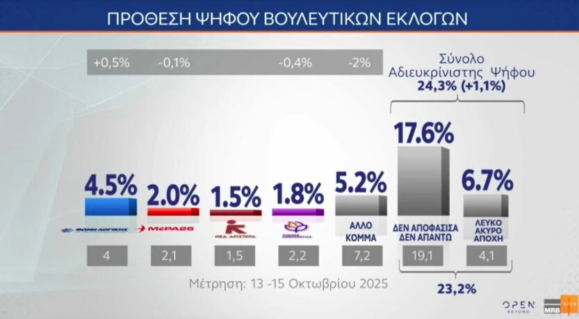Ειδικότερα, η «αδιευκρίνιστη ψήφος» διαμορφώνεται στο 24,3% έναντι 23,2% τον Οκτώβριο.