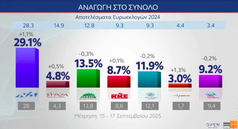 Στο 29,1% η ΝΔ, στο 13,5% το ΠΑΣΟΚ και στο 11,9% η Ελληνική Λύση στη νέα δημοσκόπηση