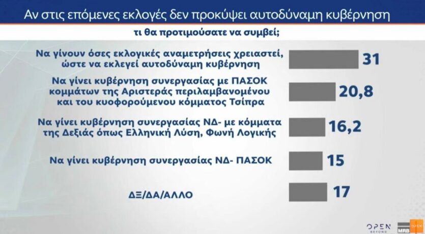 Στην ερώτηση «αν στις επόμενες εκλογές δεν προκύψει αυτοδύναμη κυβέρνηση τι θα προτιμούσατε να συμβεί» οι ερωτηθέντες απαντούν:
