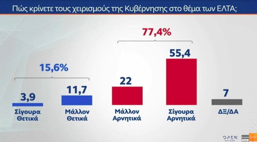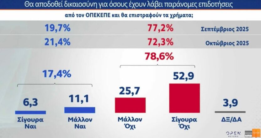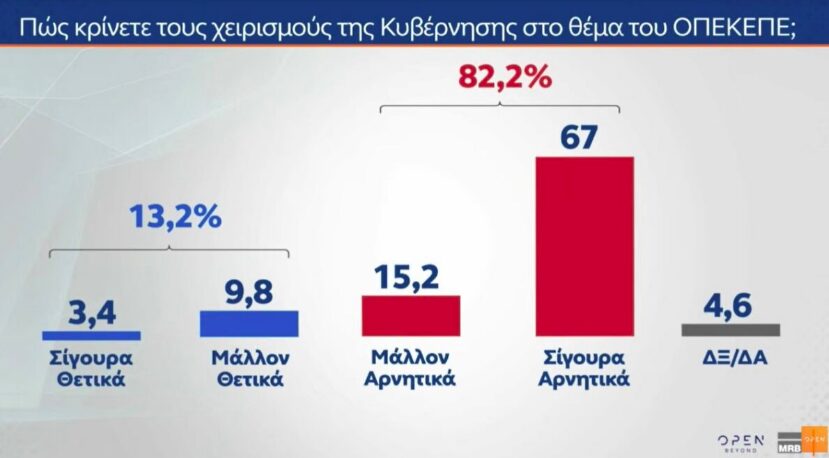 Όσον αφορά τους χειρισμού της κυβέρνηση στο θέμα του σκανδάλου του ΟΠΕΚΕΠΕ το 82,2% τους αξιολογεί αρνητικά έναντι του 13,2% που τους αξιολογεί θετικά.