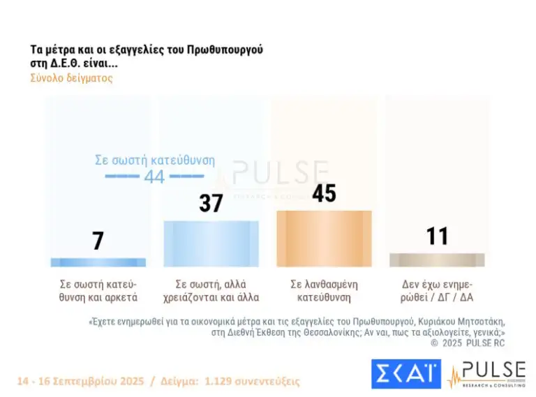 Σύμφωνα με τη δημοσκόπηση της Pulse, που έγινε μεταξύ 14 και 16 Σεπτεμβρίου δηλαδή μετά τη ΔΕΘ, οι πολίτες αξιολογούν τα μέτρα που εξήγγειλε ο Πρωθυπουργός σε σωστή κατεύθυνση σε ποσοστό 7%. «Στη σωστή κατεύθυνση αλλά χρειάζονται και άλλα» απάντησε το 37% ενώ σε λάθος κατεύθυνση βρήκε τα μέτρα το 45%.