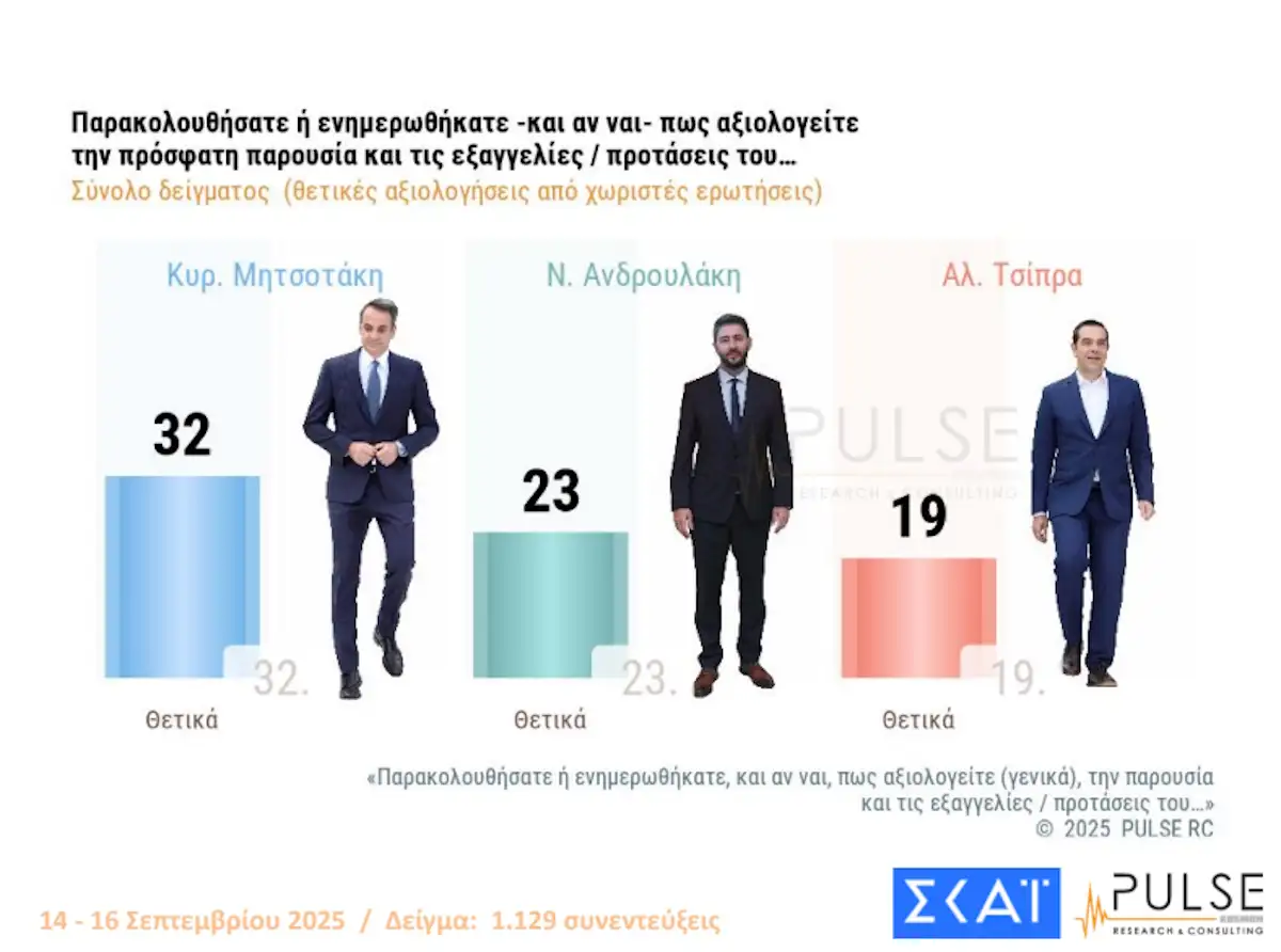 Ο αντίκτυπος της ΔΕΘ, μετά τις εξαγγελίες του πρωθυπουργού καταγράφεται στην δημοσκόπηση της Pulse που παρουσιάστηκε το βράδυ της Τετάρτης (17/9/25) στο ΣΚΑΪ.