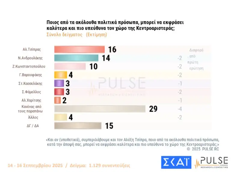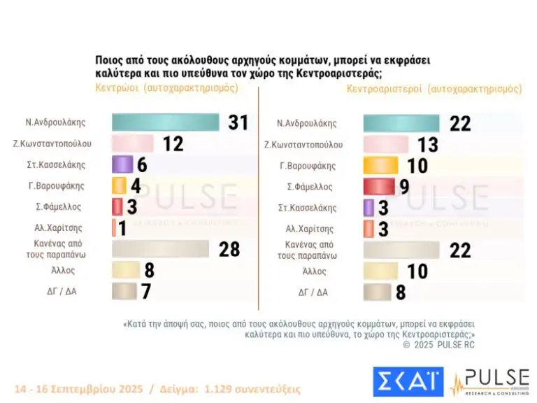 Στην ίδια ερώτηση, όταν έγινε σε πολίτες που αυτοχαρακτηρίζονται Κεντρώοι, πρώτος σε ποσοστό βγαίνει ο Νίκος Ανδρουλάκης με 31% και ακολουθεί η Ζωή Κωνσταντοπούλου με 12%. Στο ίδιο μήκος κύματος ήταν οι απαντήσεις εκείνων που αυτοχαρακτηρίζονται Κεντροαριστεροί, με ποσοστά 22% και 13% αντίστοιχα…