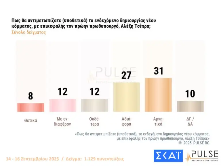 Σε ερώτηση για το πώς θα αντιμετώπιζαν οι πολίτες ένα νέο κόμμα από τον Αλέξη Τσίπρα, το 31% απάντησε αρνητικά και το 27% αδιάφορα. Με ενδιαφέρον απάντησε το 12%, ουδέτερα άλλο 12% ενώ θετικά απάντησε το 8% στο σύνολο του δείγματος.