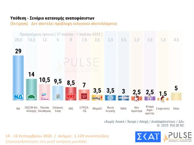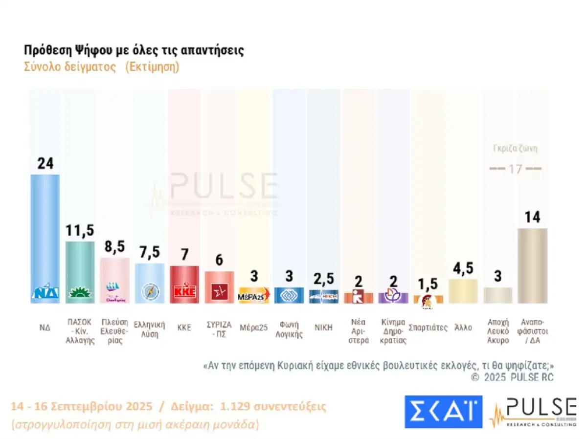 ΝΔ 24%, ΠΑΣΟΚ 11,5%, Πλεύση Ελευθερίας 8,5 Ελληνική Λύση 7,5%, KKE 7% και ΣΥΡΙΖΑ 6%.