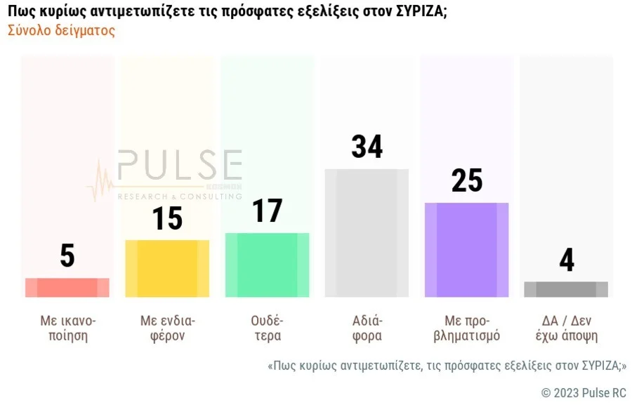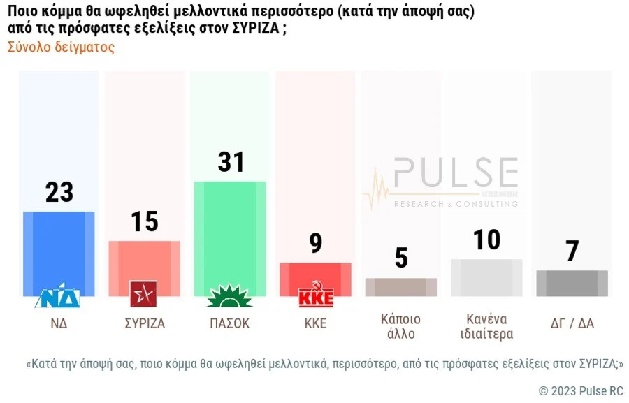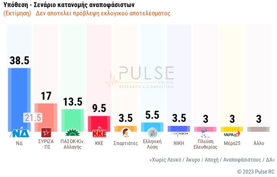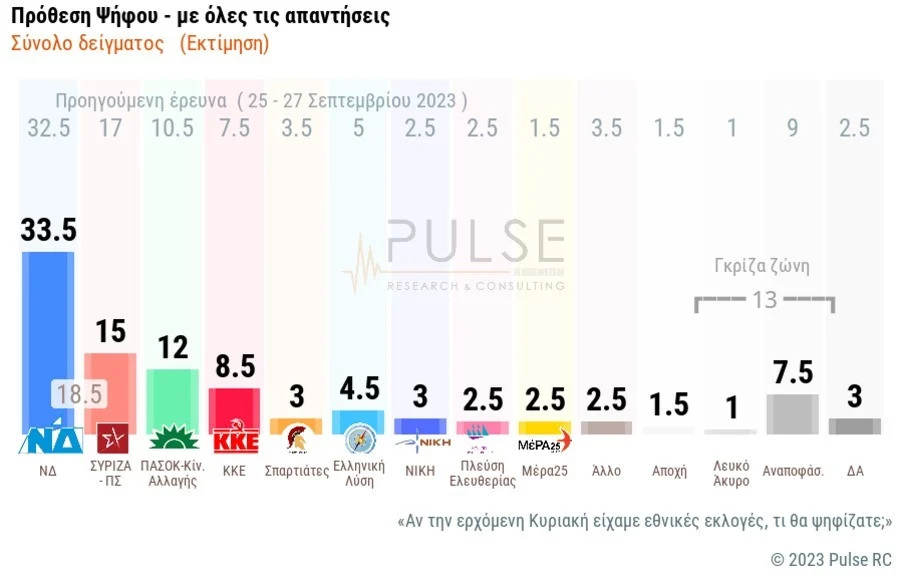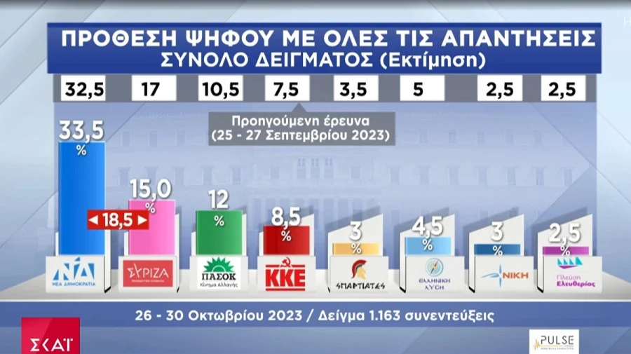 Νέα δημοσκόπηση της Pulse: 33,5% ΝΔ, 15% ΣΥΡΙΖΑ, 12% ΠΑΣΟΚ, 8,5% ΚΚΕ