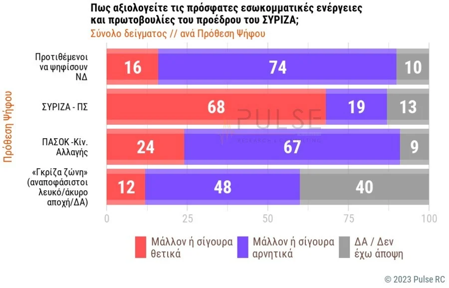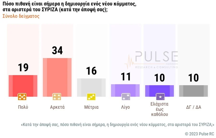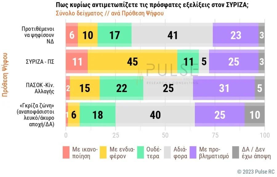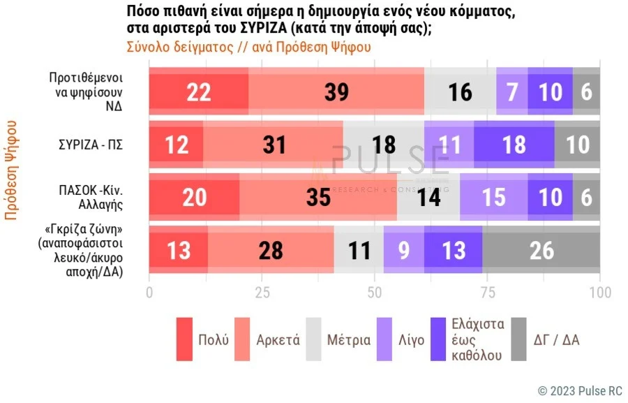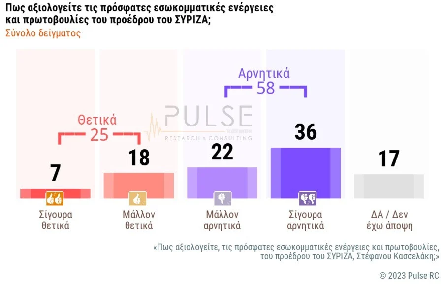 Η ίδια δημοσκόπηση επιβεβαιώνει την πολιτική κυριαρχία της Νέας Δημοκρατίας που στην πρόθεση ψήφου με κατανομή των αναποφάσιστων η διαφορά με τον ΣΥΡΙΖΑ βρίσκεται στο 21,5%: Ο ΣΥΡΙΖΑ παραμένει δεύτερο κόμμα, ενισχύονται όμως, τόσο το ΠΑΣΟΚ- ΚΙΝΑΛ, όσο και το ΚΚΕ. Οι πολίτες που έλαβαν μέρος στην έρευνα της Pulse, πάντως, κρίνουν αρνητικά τις πρωτοβουλίες του νέου προέδρου του ΣΥΡΙΖΑ, Στέφανου Κασσελάκη, στο εσωκομματικό πεδίο: Το 58% απαντά «μάλλον αρνητική» και «σίγουρα αρνητικά», ενώ το 25% απαντά ότι κρίνει τις εσωκομματικές του ενέργειες «σίγουρα θετικά» και «μάλλον θετικά». Σύμφωνα με τη δημοσκόπηση, πάντως, περισσότεροι από τους μισούς θεωρούν ότι είναι πιθανή η δημιουργία νέου κόμματος «στα αριστερά του ΣΥΡΙΖΑ», ενώ από τις εξελίξεις στον ΣΥΡΙΖΑ, το 31% πιστεύει ότι θα ωφεληθεί μελλοντική το ΠΑΣΟΚ
