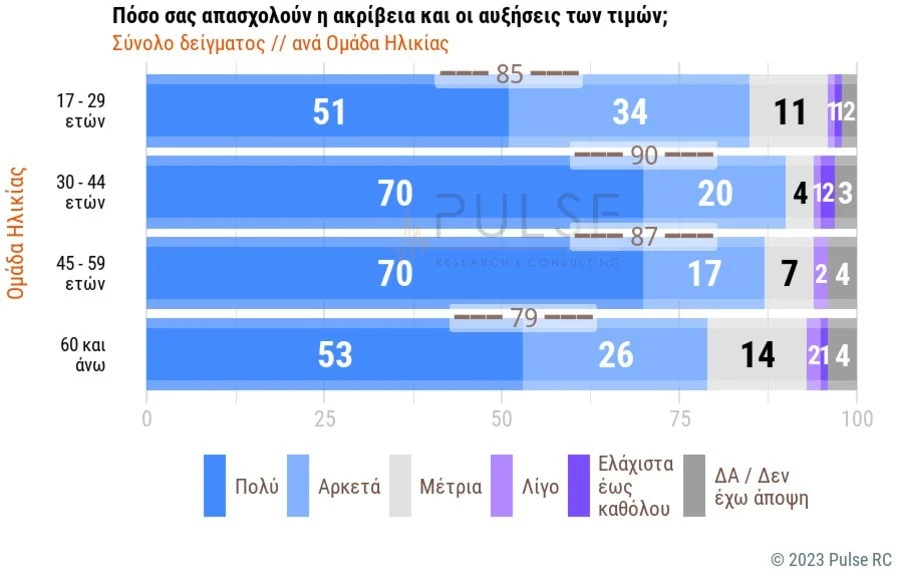 Στην ερώτηση πόσο σας απασχολούν η ακρίβεια και οι αυξήσεις των τιμών, το 63% απαντά «πολύ», το 23% «αρκετά», το 9% «μέτρια». Είναι χαρακτηριστικό ότι μόλις το 2% των ερωτηθέντων απαντά ότι η ακρίβεια απασχολεί λίγο, ελάχιστα έως καθόλου». Σύμφωνα με τα ευρήματα της έρευνας, περισσότερο προβληματισμένοι από την ακρίβεια είναι οι πολίτες 30- 60 ετών, οικογενειάρχες που αντιμετωπίζουν τα περισσότερα έξοδα. Μάλιστα, στην ερώτηση ποια από τις κατηγορίες εξόδων της οικογένειάς σας, σάς προβληματίζει σήμερα περισσότερο, το 46% απαντά τα τρόφιμα, το 23% το ηλεκτρικό ρεύμα, το 17% για το φυσικό αέριο ή το πετρέλαιο για θέρμανση, το 9% για τα καύσιμα.